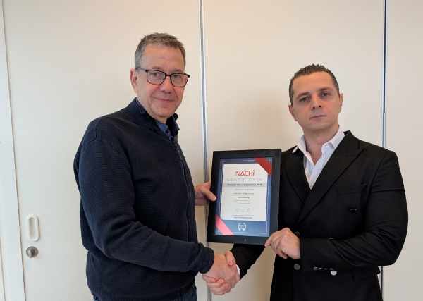 Certifikatet blev overrakt til adm. direktør Peter M. Henningsen af Gokhan Kirmaci fra NACHI EUROPE.