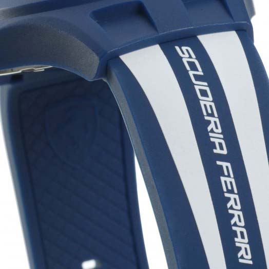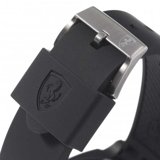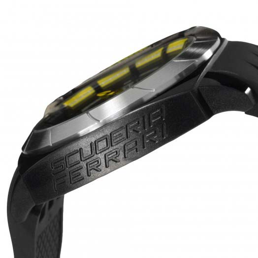 Aerodynamics and aesthetics blend seamlessly in this line of casually sophisticated Scuderia Ferrari timepieces. Designed to hit the racetrack in sleek, wind-deflecting style, Aerodinamico features an integrated, ventilated silicone strap molded to echo the design of the diffuser on the Scuderia Ferrari single-seater. Its masculine 46mm TR90 thermoplastic chassis reveals a distinctive stepped case design with curved rectangular contours