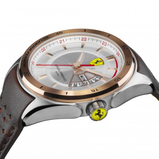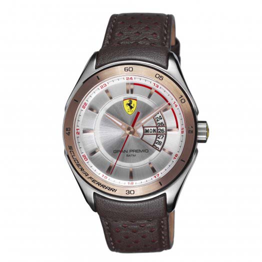 In 2013, Gran Premio premiered as a pinnacle family of automatic timepieces inspired by the high-performance 2005 FXX car. New quartz-powered 3-hand and chronograph models on strap and bracelet join this distinguished family. The diamond pattern on the new leather strap was inspired by the pattern on the vented steering wheel of another venerated race car.