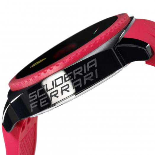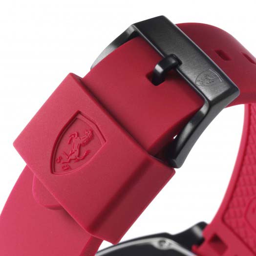 Capturing all the thrills of race day with its tire-design crown, Pit Crew adds new 3-hand bracelet models with bold links made of silicon-wrapped TR90, a high tech thermoplastic composite prized for its light weight and rich color. New designs feature graphic new stylized stripe straps suggested by an aerial view of the Abu-Dhabi Ferrari World theme park, or the Racing Shield logo on the strap upper half, mimicking the position of the shield on the sides of the racing cars.